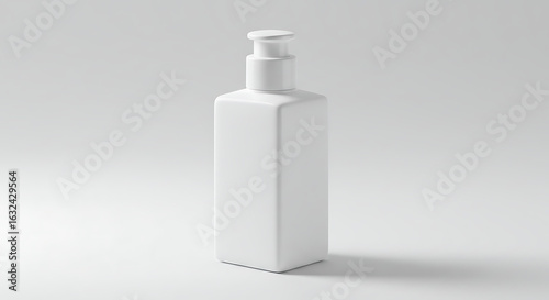 A minimalist white rectangular pump bottle stands on a clean white surface, casting a soft shadow.