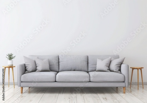 A minimalistic living room interior design with a gray sofa, two side tables, a rug, a potted plant, and two pendant lamps on the ceiling