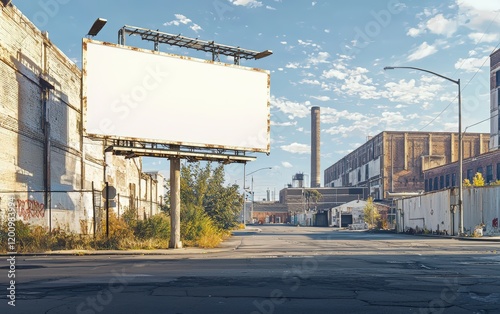 A mockup of a billboard on a busy street in an industrial area, with an empty section for text, surrounded by warehouses