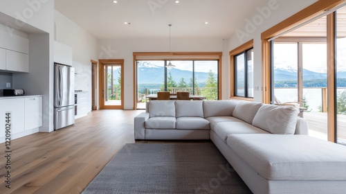 A modern, airy living room featuring large windows, a comfortable sectional sofa, and beautiful mountain views.