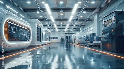 A modern and clean production surrounding, machines and technical devices, High-Tech Work Environments and Advanced Assembly Techniques.