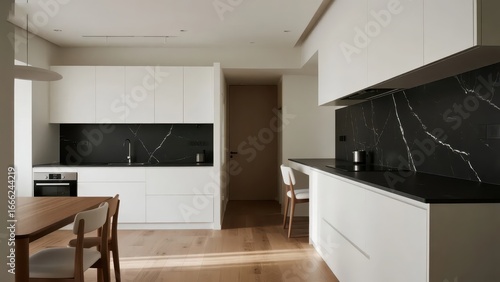 A modern and minimalist kitchen - dining space, featuring black, white, and gray as the main tones, paired with wooden furniture, creating a simple, elegant, comfortable, and practical home atmosphere