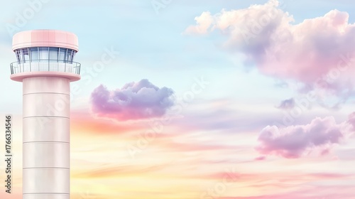 A modern architectural tower with a vibrant sunset cloudscape, ideal for advertising use.