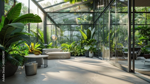 A modern conservatory with glass walls and exotic plants for a lush indoor garden experience