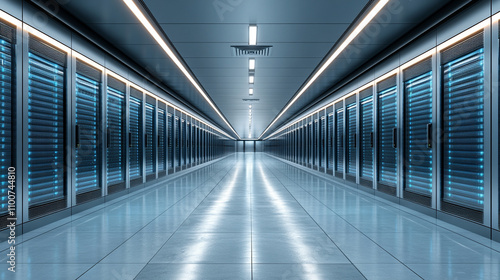 A modern corridor inside a busy data center with rows of servers creating a sense of high-tech, efficiency, and connectivity, symbolizing the backbone of digital infrastructure