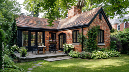 A modern cottage blends brick and black steel with large glass windows, featuring a rooftop patio and a lush garden with stone steps and an outdoor seating area.