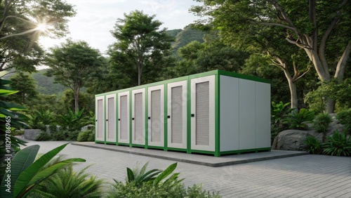 A modern energy storage facility nestled in a lush green landscape, featuring several storage units against a backdrop of trees and mountains.