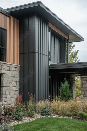 A modern home with vertical black metal paneling on the exterior walls, complemented by stone accents and wooden trim for an organic look. The house has multiple stories, featuring large windows.