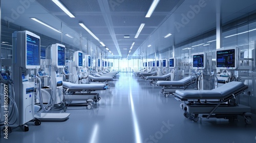 A modern hospital room featuring multiple beds and medical equipment, illuminated by bright overhead lights and designed for patient care.