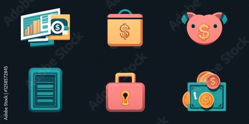 A modern icon set featuring symbols like a safe, banknote, chart, and piggy bank.