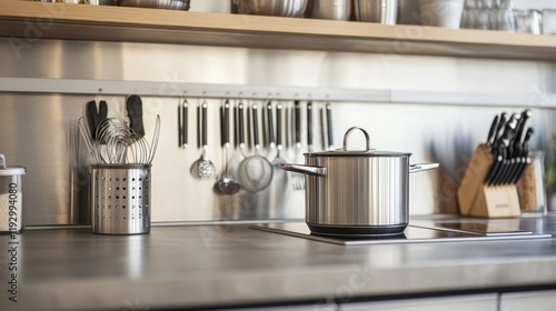 modern, kitchen, arrangement, sleek, appliance, minimalist, pot, cooking, pan, food, stove, cook, steel, metal, water, saucepan, boiling, eatery, hot drink, pot, pan, home, stainless, table, utensil, cooker, equipment, object, kitchen utensile, dinner