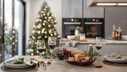 A modern kitchen scene with a completely plant-based christmas meal, featuring a festive table setting, various vegan dishes, and a decorated christmas tree in the background