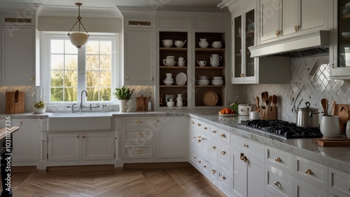 A modern kitchen with white cabinets, marble countertops, and a farmhouse sink. The kitchen features a large window, hardwood floors, and a variety of cooking tools and utensils.