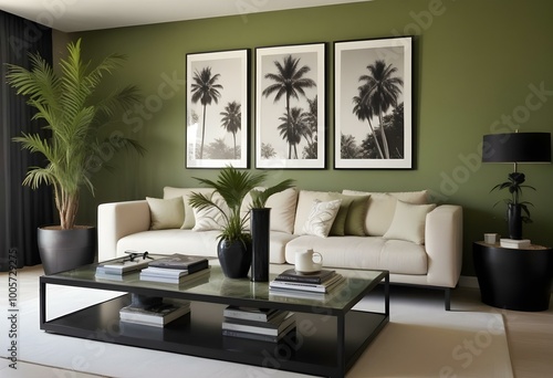A modern living room with a beige sofa, a black coffee table, and three framed black and white photographs of palm trees on the wall.