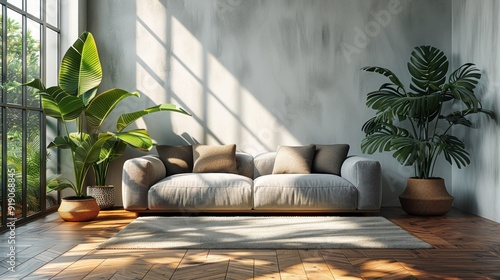 A modern living room with a gray couch and tropical plants, creating a relaxing and natural atmosphere.