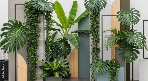 A modern, minimalist interior with a concrete wall and wooden accents, adorned with a variety of tropical plants and a few framed artworks.