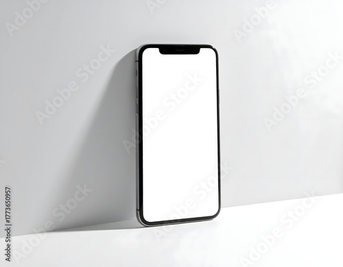 A modern smartphone with a blank screen leans against a white wall, showcasing its sleek design.