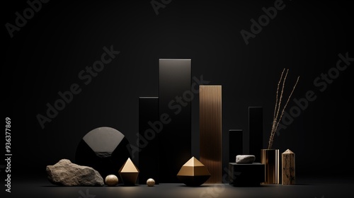 A modern still life composition featuring various geometric shapes and natural elements. The arrangement includes black and gold objects, such as pyramids, cylinders.