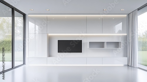 A modern, white wall unit with a built-in entertainment center, featuring minimalist design and high-quality finishes