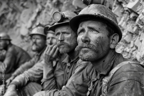 miner, coal, fatigue, group, soot, monochrome, coal cellar, work, contemplation, hardship, labor, serious, man, dirty, occupation, teamwork, industrial, history, dignity, strength, perseverance, resilience, safety, job, uniform, determination, rugged, environmental impact, energy, industry, manual labor, vintage, solidarity, camaraderie, exhaustion