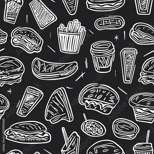 A monochrome pattern featuring various food and drink illustrations, including pizza, ice cream, coffee, pastries, and tacos, designed with bold outlines on a black background.