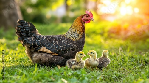 hen, chick, chick, mother, farm, rural, nature, countryside, outdoors, grass, green, field, sunlight, summer, spring, animal, bird, poultry, feathered, yellow, brown, black, cute, family, parenting, protection, care, farm animal, domestic, wildlife, agriculture, baby, love
