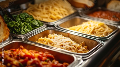 A mouthwatering pasta bar with options like spaghetti, penne, and fettuccine