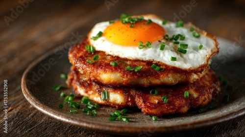 A mouthwatering stack of crispy potato cakes topped with a perfectly fried egg invites indulgence, offering a great representation of comfort food at its finest and most delicious.