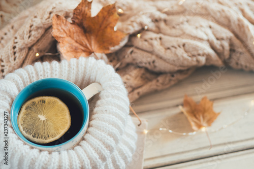 tea, winter, sweater, warm, warming, comfort, home, leaf, dry, autumn, lemon, cosy, relax, drink, hot, weekend, foulard, cup, holiday, modern, white, calm, season, design, decoration, style, indoor, table