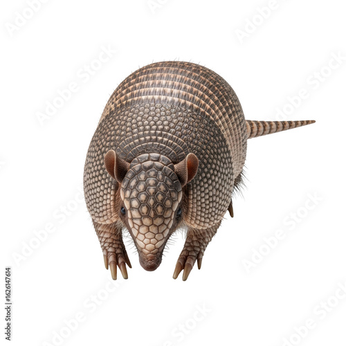 A Mulita armadillo with a distinctive brownish-gray armored shell and tapering tail, isolated on a seamless transparent background with strong contrast. Concept of animal accuracy