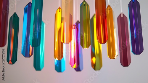 A multicolored energy chime with dynamic shapes and glowing tips, hanging against a white backdrop.