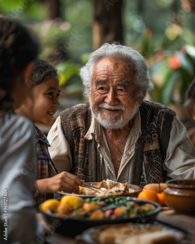 meal, backyard, family, laugh, grandparent, children