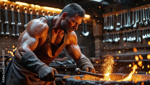 A muscular male blacksmith intensely works the glowing metal, sparks flying as he shapes it with focused determination in his rustic workshop.