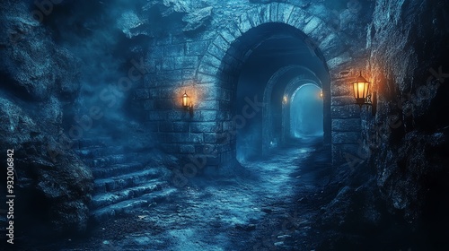 A mysterious, dimly lit tunnel with stone arches and lanterns creating an eerie atmosphere, perfect for fantasy or horror settings.