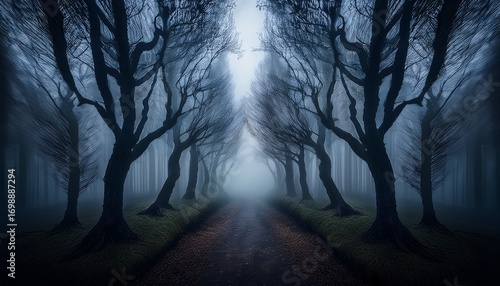 a mysterious foggy forest path lined with dark twisted trees under a misty sky creating an eerie nighttime atmosphere full of suspense