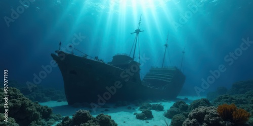 A mysterious shipwreck rests on the ocean floor, illuminated by rays of sunlight. This captivating underwater scene evokes adventure and exploration.