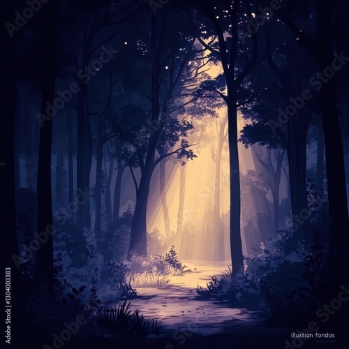 tree, forest, path, light, shadow, nature, wood, branch, sky, dark, foliage, sun, ray, illustration, landscape, plant, night, scene, artwork, serene, tranquil, calm, environment, aethereal, mysterious, artistic, atmosphere, journey, glow, silhouette, dense, brush, texture, abstract, scenic, wood, peaceful, dreamy, wild, outdoors, vibrant, trail, dusk, underbrush, pathway, vegetation