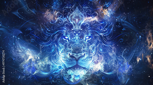 zodiac, signs, leo, art, lion, illustration, astrology, cosmic, star, energy, blue, mystical, star, design, space, night, colours, light, card, pattern, swirling, planet, glowing, science