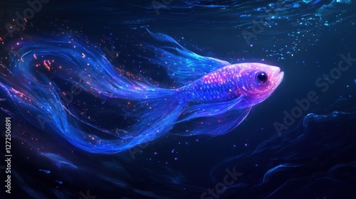 A mystical Lumo fish with radiant blue and purple hues slowly rising to the oceans surface, leaving a glowing trail in the dark abyss.