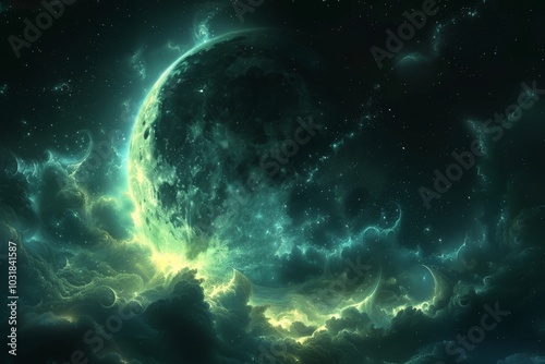 moon, cloud, night, sky, celestial, glowing, mystical, dark, star, universe, aethereal, green, atmosphere, dreamlike, cosmic, luminescent, scenery, nature, beauty, calmness, outer space, horizon, serenity, illumination, landscape, fantasy, dream, astronomy, magic, shadow, light, wonder, night time, cosmos, twilight, starlight, surrealism
