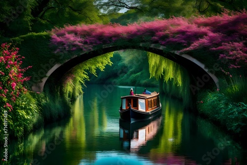 A narrow boat peacefully glides through a thin canal, surrounded by a sea of lush greenery
