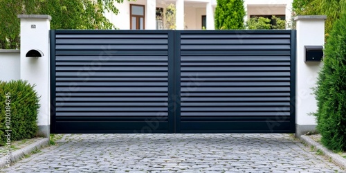 A navy blue aluminum double gate with horizontal slats and vertical black metal frames, set against the backdrop of an elegant white house
