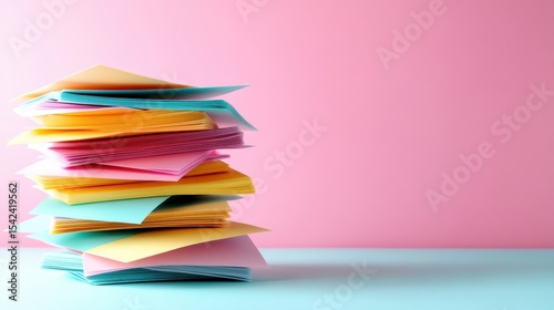 A neatly stacked array of colorful paper sheets sits against a soft pink backdrop, demonstrating an appealing organization of stationery in a playful and cheerful manner.