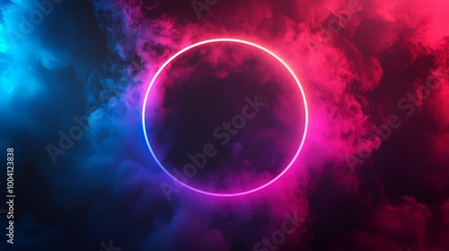 A neon pink circle is surrounded by purple and blue smoke.