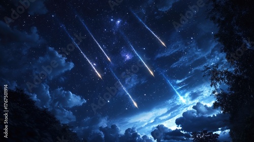 A night sky with animated shooting stars and glowing clouds, creating a magical atmosphere