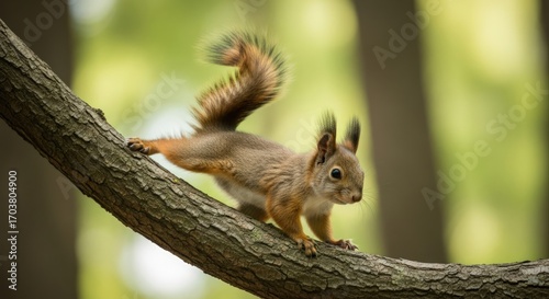 A nimble red squirrel with a fluffy tail balances on a thick tree branch in a sunlit forest.
