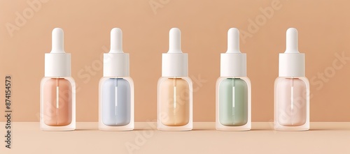 A number of skincare packages packaged in small, colorful bottles were photographed on a light brown background
