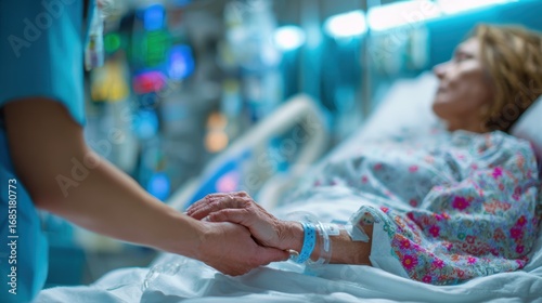 A nurse holds the hand of a patient in a hospital, symbolizing care, empathy, and the human connection in healthcare.