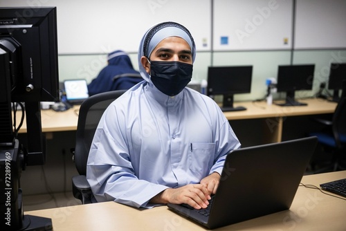 a nurse in a medical office, wearing a surgical mask, focused on her laptop at the desk