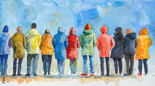 group, people, standing, line, individual, varied, look, different, direction, painting, art, canvas, exhibition, display, museum, cultural, heritage, colourful, attire, style, social, gathering, waiting, queue, row, lineup, variety, person, human, figure, line, arrangement, order, composition, position, posture, expression, face, artistry, creative, visual, illustration, artwork, artistic, gallery